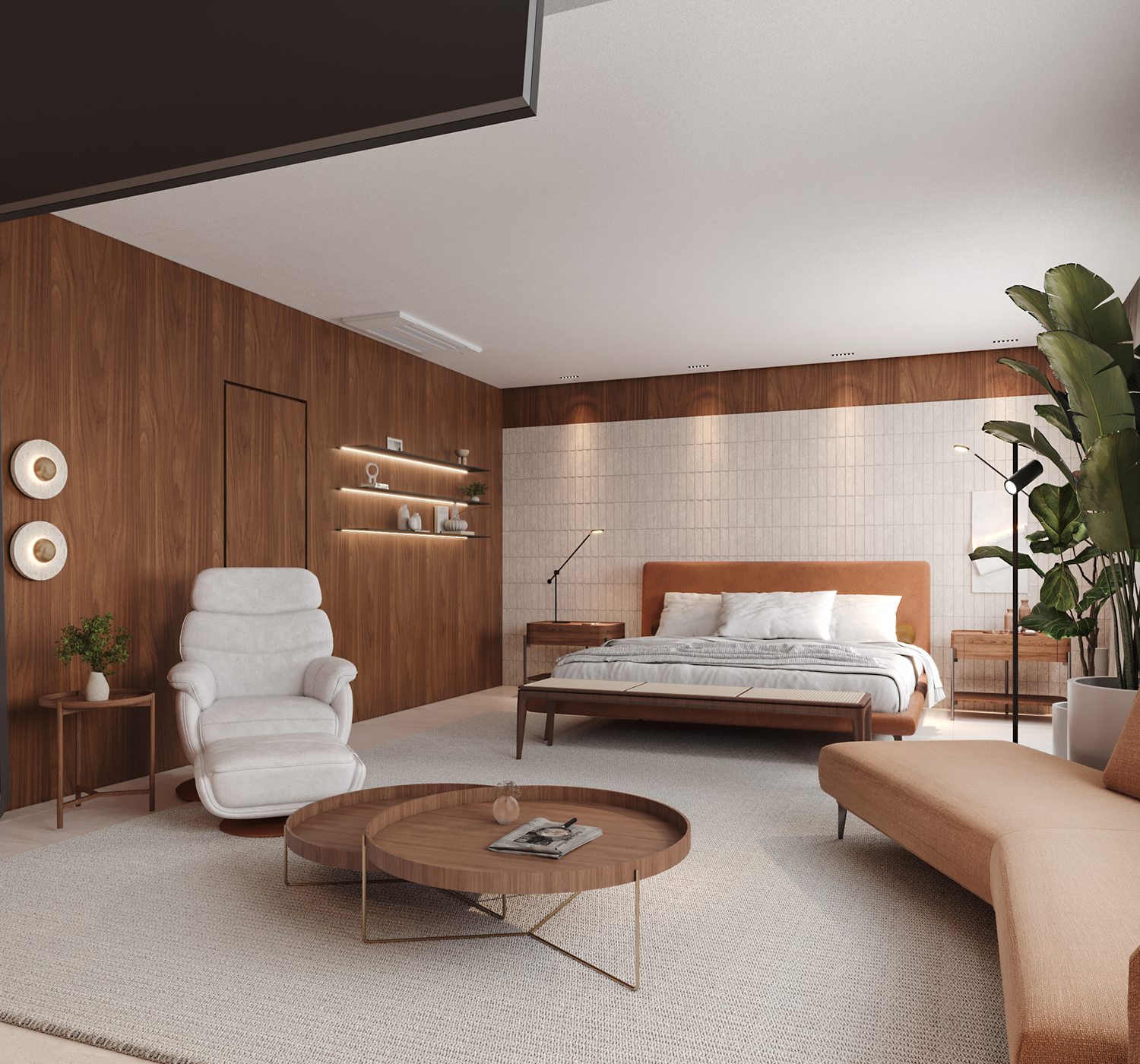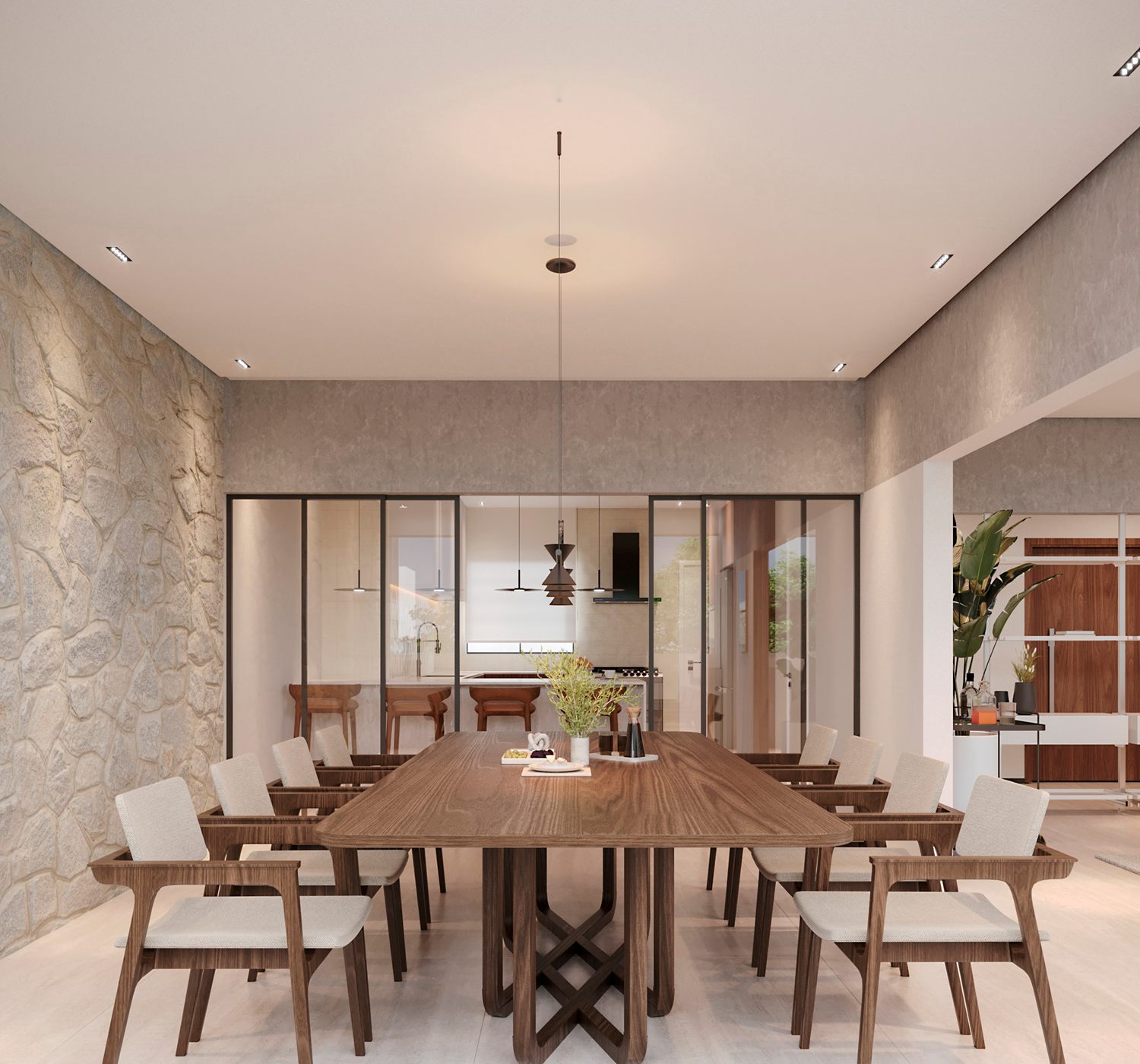 O projeto valoriza o contraste entre a madeira escura e os tons claros, criando ambientes elegantes e acolhedores. A base neutra dá leveza e amplitude, enquanto a madeira traz profundidade e calor, equilibrando o espaço de forma natural. A iluminação realça texturas e destaca o mobiliário de linhas contemporâneas, reforçando a sensação de sofisticação sem abrir mão do conforto. O resultado é um espaço que combina modernidade e aconchego de forma simples e sofisticada.